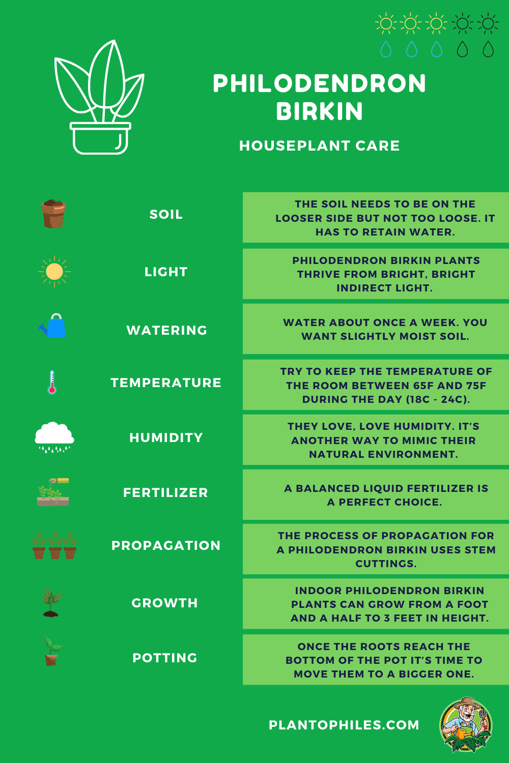 That is they are slightly more sensitive to wet soil than their relatives. Philodendron Birkin care requirements include bright indirect light humidity of 40-70 and well-draining soil. Well draining The majority of the water should drain out the bottom so as to not leave your plant too wet.